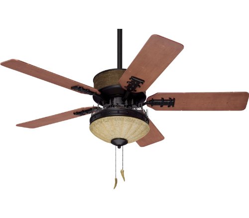 Hunter 28523 Bear Creek fan blanaces the boldness of its rugged construction with a whimsical wilderness panorama. The rustic bark-like housing is offset by sturdy metalwork. Whether your rustic little cabin is in the mountains, on the lake or in your dreams, the Bear Creek is sure to put a campfire song in your heart. Hunter is the peak of eco chic. By using your Bear Creek fan properly throughout the year you can significantly decrease your personal energy use without sacrificing comfort. Whisperwind high performance 172 x 20 mm motor delivers ultra-powerful air movement of 6,7724 cfm and assures quiet operation. Bear Creek features an integrated 120-Watt Amber Scavo glass bowl fixture for a warm take on rustic lighting. Light fixture uses three included 40-Watt candelabra bulbs. Designer Brittany Bronze finish and five furniture grade veneer Gouged Distressed Cherry blades enhance the lodge look. With a stylistic depth unmatched in the industry this Prestige fan is the choice of many deocrators and designers. Included weathered-antler pullchains add a touch of playfulness to its design. Hunter's patented anti-vibration technology featuring the unique triangular hanger ball system reduces torque for wobble free performance. Installer's choice three-position mounting system lets you mount it flush to the ceiling, on a regular downrod or on angled ceilings. Hunter's EZ-hang mounting system makes installation simple and safe. Uses Hunter standard downrods only. Lifetime limited warranty on fan motor, 1 year limited warranty on all other parts except motor, glass globes, or light bulbs.