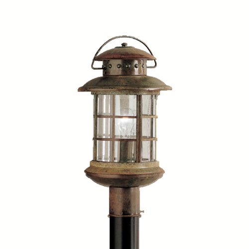 The Detailed Description of Kichler Lighting Kichler 9962RST Rustic 1-Light Outdoor Post Lantern, Rustic Finish over Solid Brass with Clear Beveled Glass PanelsFeatures