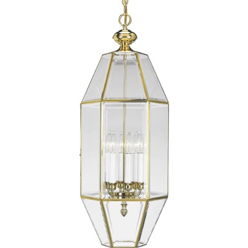 Progress Lighting P3779-10 Six-sided foyer fixture with clear, beveled glass panels. Hinged panel for ease of relamping. Polished Brass UL listed for damp locations. Polished Brass 6-light Foyer Pendant Classic clear beveled, glass fixture bound in brass frame provides an elegant touch to grace your home's entry or stairway. Polished Brass finish Clear beveled glass 12-1/4 In. Diameter x 31-3/4 In. Height Uses (6) 60-watt candelabra bulbs Listed for damp locations.