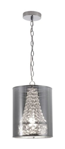 Glamour and elegance is all bundled into one smashing ceiling lamp. The Byrion ceiling lamp boasts strung crystals shielded by a metallic shade. The base is chrome. The lamp is UL approved.
