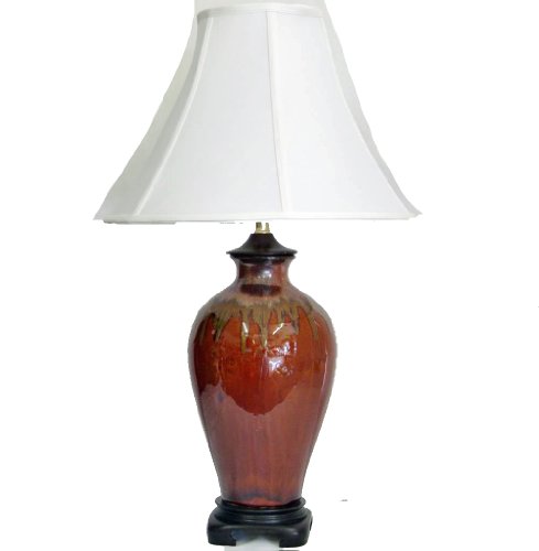 25-Inch by 15-Inch Brown Drip Earth Toned Hand glazed Ceramic Table Lamp with Double Lined White Silk Bell Shade, Brass Cap and Wood Base. Brass Hardware and fittings. 3-way, 150 W Max Bulb with Turn Knob Switch.