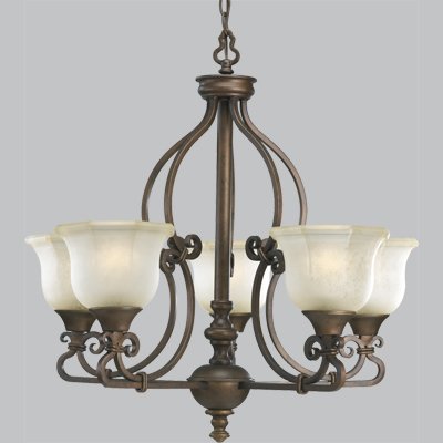 Progress Lighting P4584-102 Five-light chandelier with beautiful bell-shaped shades of sculpted jasmine mist glass that are set off by forged metal frames and accentuated by bands and bishop finials. Roasted Java Thomasville Lighting Collection Guildhall Collection Roasted Java 5-light Chandelier With Old English influences, the Guildhall Collection features beautiful bell-shaped shades of sculpted jasmine mist glass that are set off by a forged metal frame. Accentuated by bands and bishop finials, simple scrollwork adds a touch of elegance, blending in with any room. Roasted Java finish Jasmine mist glass 27 In. Diameter x 25-3/8 In. Height Uses (5) 100-watt medium base bulbs