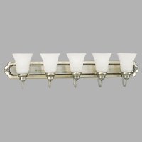 Progress Lighting P3010-43 Bath bracket with brass highlights, backplate and etched ribbed glass. Colonial Silver Mount in "up" or "down" position. Huntington Collection Colonial Silver 5-light Wall Bracket Rich with Victorian-era details, the Huntington Collection features reeded arms and cast elements in a striking antiqued patina finish. Etched glass shades are cast with a stately fluted relief pattern and beaded detail. Colonial Silver finish Etched ribbed glass 37 In. Width x 9-1/4 In. Height Uses (5) 100-watt medium base bulbs Fixture mounts in up or down position