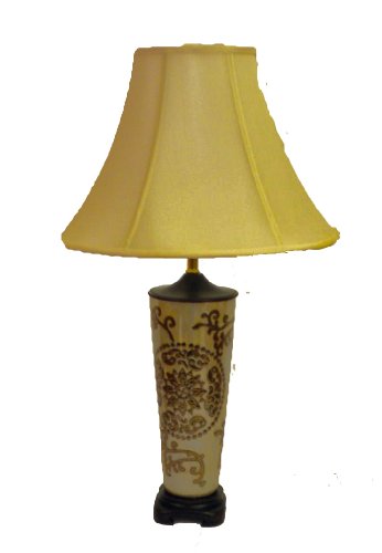 28-Inch by 17-Inch Pearlized Beige with Offset Brown Medallion Design and Off White Silk Double Lined Bell Shade. 3-way, 150 Watt max. Turn Know Switch.