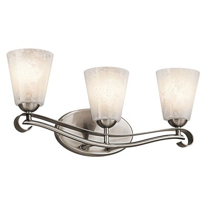 Kichler Lighting 45368CLP Mara 3LT Vanity Fixture is defined by its class. The cone shape features wispy white swirls of dense white intermixed with etched glass. All supported by an exciting scroll and rod strap design in a Classic Pewter finish. Whether you are looking for that perfect fixture for the master bathroom or the main hall bath; the exquisite lines of this fixture create an element that adds both form and function to this elegant style making this fixture a perfect choice if you are looking to bring a touch of charm to your home. 45368CLP is 22.25IN wide x 9.5IN high x 5.5IN extension, and has a back plate that is 9IN wide x 5IN high. 45368CLP comes one per package, and requires three 100W medium base incandescent bulbs (not included), dimmable using a standard incandescent dimmer. Since 1938, Kichler Lighting has offered a distinctive array of lighting solutions that reflect your individual personality, tastes and plans. Kichler brings you an unparalleled variety of exciting style families, unique finishes, fresh colors and unequaled quality. Whether its casual, contemporary, transitional or traditional, you'll find it with Kichler, lighting that defines your style.