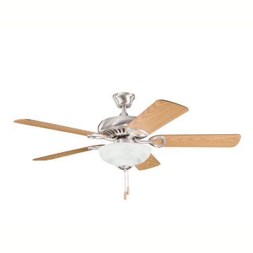 Finish:Brushed Steel, Blade Finish:Light Oak and Medium Oak, Glass:Umber Alabaster, Light Bulb:(3)40w B10 Cand F Incand Sutter Place Select Three-Light 52 Ceiling Fan Fan Blade Pitch: 12 Fan Blade Span: 52 Fan Motor Size: 153mm x 15mm AC Induction Pull Chain, 3Speeds Forward & Reverse Includes 4' Downrod Low Ceiling Adaptable, Flush Mount Canopy (included) ENERGY INFORMATION with fan at high speed: Air flow: 4500 Cubic Ft. Per
