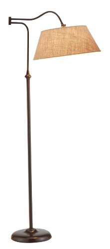 This transitional piece combines a traditional burlap shade and antique bronze finish in a modern style. The Rodeo floor lamp has a swing arm adjustment with a curved pole from which the shade is suspended. The swing arm rotates 180-Degree horizontally, and the shade may be adjusted vertically and secured with a locking key. The flared shade is made of a hard-backed khaki burlap fabric. It has a three-way rotary socket switch.