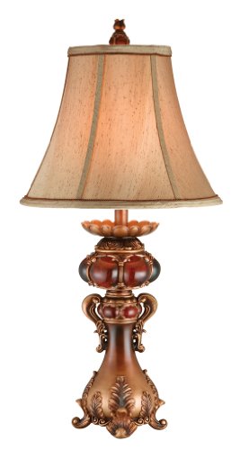 Ore International is a leading provider of innovative, high quality lighting fixtures, gift and furniture for the consumer market. Elegant design, great value and prompt service are hallmarks of Ore International. The very unique design of this ornate table lamp has hues of crimson and gold and the details are anything but ordinary. Constructed of polyresin and painted with shades of brown and red, this lamp resembles marble-like stone and antique style. The tan colored bell lampshade is the perfect complement to the lamp design. Lamp is UL listed and uses one 3-way 100-Watt type A bulb. Measures 17-Inch x 17-Inch x 31-Inch and weighs 7-Pound. Lampshade measures 17-Inch x 17-Inch x 12-Inch. Made in China.