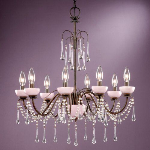 Laura Ashley is one of the best-loved fashion and home furnishing companies in the world - it focuses on stylish fabrics and lush colors. The Laura Ashley Home Lighting collection features a family of lamps, pendants, and fixtures, as well as mix-and-match portable lamps and shades. The Laura Ashley line is distributed through specialty retailers and independent stores. 8-light chandelier. Gold-flake bronze finish with pink opaque-glass bobeches. Accented with glass drops and pearl chain. 72 in. of chain and 108 in. of cord included. Traditional style. Requires eight 60-watt candelabra-base bulbs (not included). Overall dimensions: 23 diam. x 26H inches.